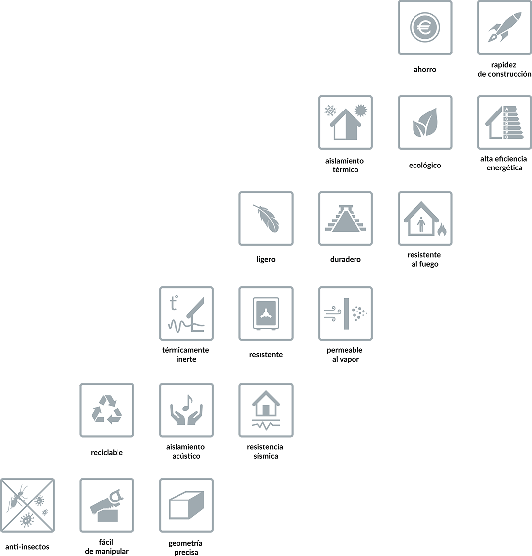 Este material ofrece un excelente confort térmico, protege tanto del frío como del calor, es ignífugo y permite la realización de paredes uniformes. Todo ello posibilita la instalación de soluciones constructivas y la realización de sistemas de ingeniería de manera más sencilla en comparació a instalaciones en las que se haga uso de un muro compuesto.